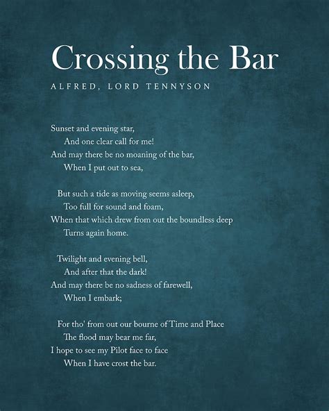Crossing the bar, short poem by alfred, lord tennyson, written in 1889 at age 80, three years before he died and published in the collection demeter and other poems (1889). Composed by tennyson in 1889, three years before he died, crossing the bar is an intensely personal poem which engages with the themes of old age, faith, doubt, life and.