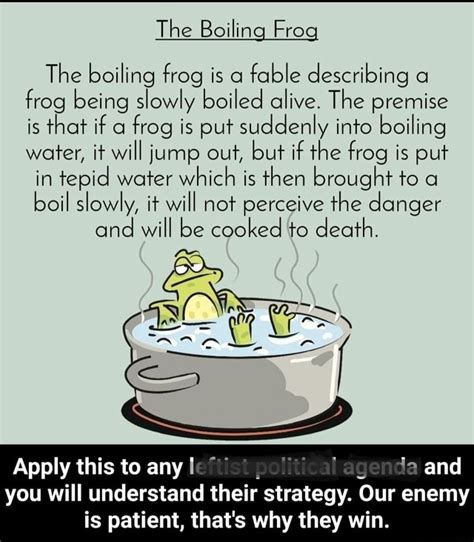 The boiling frog is a fable which tells the story of a frog who is placed in a pot of boiling water. But if you place it gently in. But if it is placed in tepid water and the heat slowly rises, the frog will stay cooking in the water until it is boiled to death. If a frog is.
